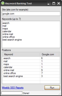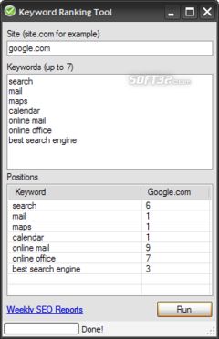 Having a solid web presence is critical to online success but establishing that presence requires effective SEO efforts. But good search engine optimization requires frequent monitoring. Otherwise, the results of those efforts will be unknown. With the Keyword Ranking Tool, checking up on those efforts is as easy as checking your email. This free software is easy to use and to set up so even inexperienced and novice users won't have any trouble setting up the automatic reporting and alerts. Each day, you can receive the processed and the raw reports of how the site, blog, or content has fared in the search engine rankings. Additionally, weekly or monthly reports of your page's rankings will be emailed to you for immediate viewing. You can see where your site is ranked in all three of the major search engines: Google, Yahoo, and MSN/Bing. Additionally, you will be notified of the change in search engine rankings for your set of keywords simultaneously. The report will be easy to view and provides invaluable information that can guide your SEO efforts or that you can pass onto your SEO guru. You can also have the Keyword Ranking Tool alert you if your ranking changes or if you drop off the rankings altogether with a particular one of your keywords. All of these efforts make your work much easier and you won't have to worry about manually checking the status of your optimization. This free program can be used for any type of optimized online content, including web pages, blogs, and more. Similar Software