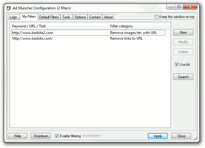 Ad Muncher is a powerful advert and popup blocking system for all browsers and advert-displaying programs like Pando, SopCast, ICQ, Morpheus, Kazaa, Grokster, Opera, PalTalk, iMesh, Bearshare, LimeWire, TVAnts, etc.Ad Muncher can be configured to block anything that annoys you, with simple options to block common annoyances like: