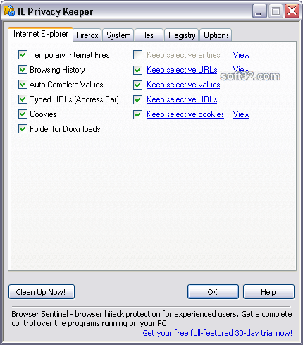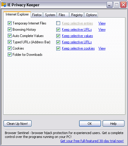 Simple, fast and efficient browsing history cleaner for Internet Explorer and Mozilla Firefox. Automatically cleans up all traces of your Internet and system activity when you close the browser or shutdown the computer. IE Privacy Keeper can correctly clean up the index.dat files without the need for a Windows restart. It also cleans up your system activity (recent documents, MRU lists, etc.). The program allows you to keep selective history items to conceal the fact of the cleanup. IE Privacy Keeper has a secure deletion feature to prevent data recovery. You can specify custom files and registry keys to delete. IE Privacy Keeper is absolutely free! Get it now and forget about online privacy issues! Similar Software