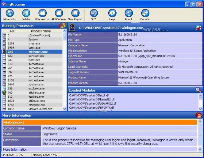 myProcMan is an interactive user friendly process manager for Windows. Detailed information provided about programs and processes running on the computer.Tool’s database contains more than 12000 processes and provides guidance on the usefulness or not of these programs and services, and removal procedures when recommended.