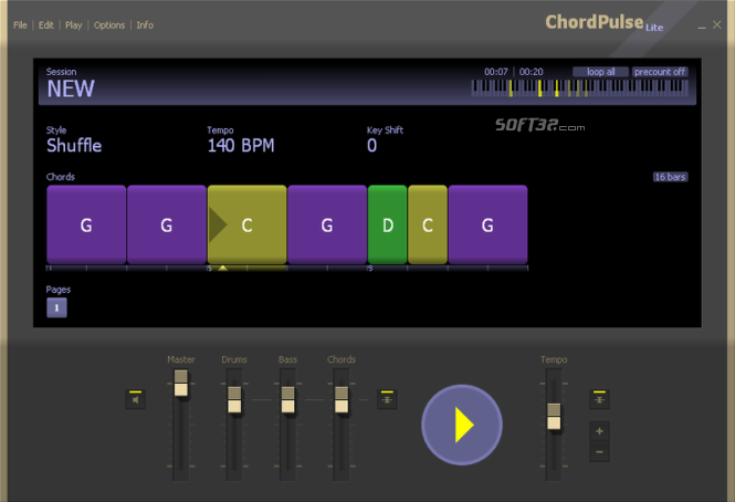 Practice and compose with this free auto accompaniment software. Set up a chord progression, select a music style and press play. ChordPulse Lite will play your automatic accompaniment with drums, bass and chords that you will enjoy playing along with. In contrast to mp3 backing tracks, midi files or play along CDs, here you can customize your backing tracks to fit your needs. You can change chords, music style, tempo and key in an instant. ChordPulse Lite is an auto accompaniment program that can be mastered in seconds. You can jam along with a complete automatic arrangement, a drum machine with bass or a metronome with chords. ChordPulse Lite is great for music training, vocal training, practicing, learning, soloing, improvisation and composition. It's a handy songwriting tool: you can try out musical ideas very quickly. ChordPulse Lite features 24 music styles (pop, rock, dance, ballad, jazz, swing, shuffle, Latin, waltz) + 2 metronome styles, 4/4 and 3/4 time signatures, 5 basic chord types (major, minor, augmented, diminished, dominant seventh), slash chords, customizable chord inversions, 36 chord pages to structure your chord progressions, three repeat modes and an independent loop region. The sound levels of the drums, bass and chord sections of the accompaniment can be controlled independently. Adjust the sound mix to your tastes, or turn down tracks completely, thereby creating space for your live instrument. Turn down "Chords" and get a drum machine with bass. Turn down "Drums" and get a bass and chords only accompaniment, so you can practice as a drummer. Or simply use the default volume mix and play along or sing along with the full backing band. Pick up your acoustic or electric guitar, bass guitar, banjo, trumpet, flute, saxophone, fiddle, blues harp, and jam along with your custom backing tracks. This freeware midi automatic arranger will work with any General Midi compatible software or hardware midi device. Let ChordPulse Lite raise your pulse. Similar Software