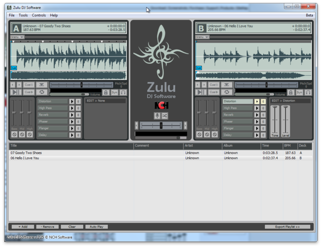 Zulu is free professional DJ mixing software for Windows PCs. Mix and broadcast live music, audio and mp3s. When loading a music track onto a deck it will automatically scan the file for a beat and assign a beat per minute (BPM), and will change the tempo in the second deck for perfect synchronization and a seamless crossover. Drag and drop music into and around Zulu's interface and preview an upcoming track through headphones via a secondary audio output. Apply effects on the fly and more. Zulu professional DJ mixing software features include: