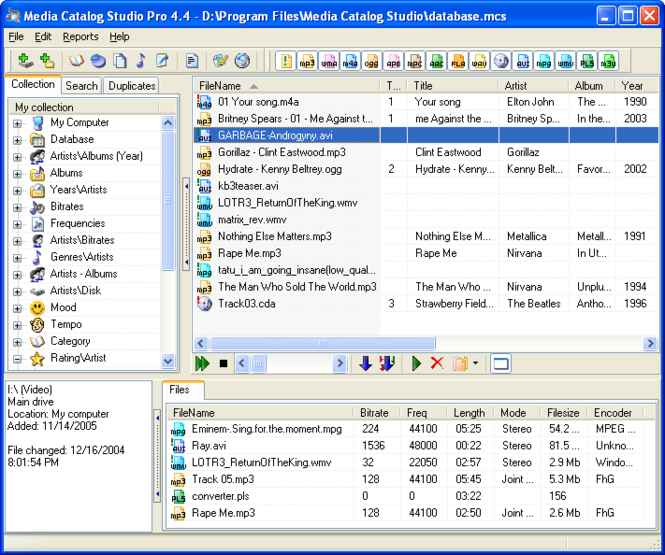 Is your video and music file collection growing out of control, making it impossible to find anything? Fight this problem with Media Catalog Studio, a handy software application for classifying and tracking media files. This database is capable of identifying media files on any storage devices - hard-drives, floppies, external drives, CDs and so on. The program supports MP3, WMA, MP4, MPC, APE, OGG, AAC, FLAC, WAV, AVI, MPEG, WMV, WavPack and Audio CD files and comes with a lot of great perks - duplicates finder, batch tag editor for MP3/WMA/OGG/AAC/APE/MP+/M4a/WV files, to name a few. The best thing about this database is that it allows users to enter all essential information about music file - track number, name of the music piece, name of the author, album, year of release, commentary, composer, mood, genre, rating and so on. Conveniently, all files stored in this database can be sorted out by artist, album, year, bitrate, frequency, genre, category, rating or any field/category. The search in the database can be conducted using multiple parameters, like file properties (name, size, etc), tag information or lyrics. Media Catalog Studio features internal tag reader and editor for MP3-tags (ID3v1, ID3v2 and Lyrics3 versions) and supports an option for storing pictures in addition to lyrics.The program is intuitive, user-friendly and easy to learn. The great thing is that you can create playlists for WinAmp or Windows Media Player with a few mouse clicks. In addition to supporting CDDB, all data from the program can be exported to Excel; there also are a lot of other convenient options, like disk location tracker, or media file statistics feature.