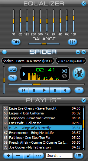 Spider Player is a skinnable audio player with full support for all major audio formats: MP3, AAC, WMA, OGG, FLAC and others. Its most interesting features include audio streaming, integration with Shoutcast and Icecast radio directories, lossless Internet radio recording, Last.fm scrobbling, advanced CD Ripping and Converting capabilities, FreeDB integration, 32-sound processing for crystal-clear sound, customizable local and global hotkeys and crossfading support. Spider Player is small and blazingly fast, and uses very few system resources. Similar Software