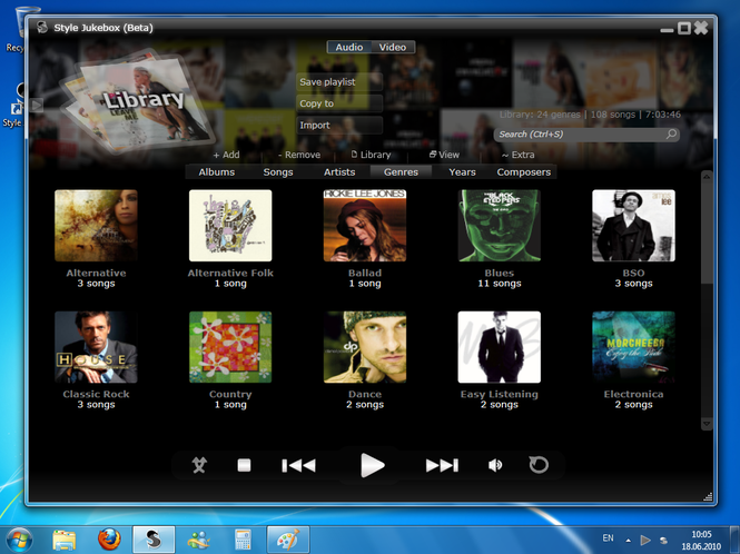 Style Jukebox is the next generation media player for Windows, allowing you to organize your audio and video library under an easy to use and unique user interface. Download Style Jukebox and let it entertain you. Audio / Video Support