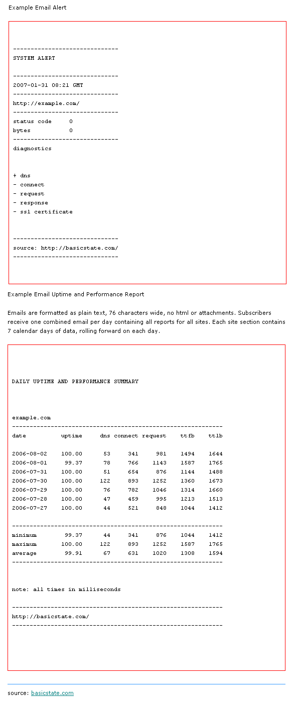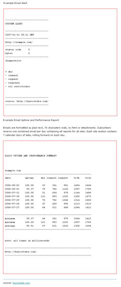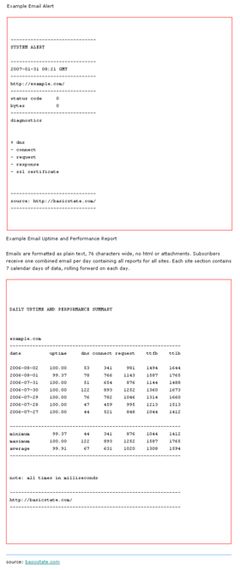 Free website uptime monitor service from basicstate.com alerts you to server and network problems automatically and instantly by email or sms. Features 15 minute testing cycle, multiple alarm destinations, and problem escalation settings. A powerful management tool for any web site administrator. Subscribers can also add alerts from an extensive list of e-commerce partner sites. Similar Software