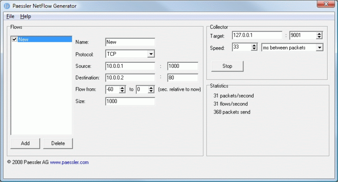Netflow Generator creates artificial NetFlow Version 5 data streams without the need for NetFlow compatible hardware. It is the perfect tool for testing the NetFlow functionality of PRTG or other NetFlow compatible programs. NetFlow Generator runs on a PC and sends NetFlow 5 Packets (via UDP) to a specific target computer which processes the data. You can create various patterns and loads of traffic. While the simulator is active it will create NetFlow packets which contain information about the selected traffic pattern. These packets contain the same information as a router/switch would send if it saw the simulated traffic pattern (the simulated traffic itself is not generated).