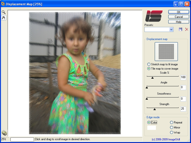 Displacement Map is an amusing image distortion, Photoshop-compatible plug-in for Windows designed by ImageSkill Software. It allows a user to get a view of the geometrically distorted image.The user is free to choose any displacement map which determines the shape of the image deformation and adjust its strength.
