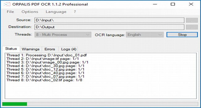 Optional parameters settings are available for the input mode that can be either a file or a folder. A convenient drag and drop option is also supported. Folders as well as sub-folders can be processed. The number of pages processed by the engine is displayed in real-time. For each document full log information is provided, as well as warnings and errors if any.