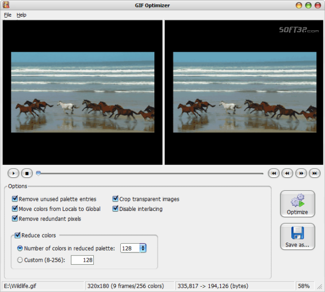 GIF Optimizer is a nice utility you can use to easily optimize GIF file for your website. Savings of up to 90% in file size is possible, which can decrease web page download times, save the disk space and reduce bandwidth charges. GIF optimizer includes two preview panes to help you compare the original GIF with the optimized GIF. The color reduction option is able to create much smaller GIF! This software is free and will never expire!