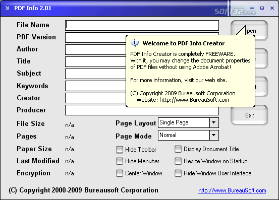 View and modify the summary and document properties as well as hidden information stored in the header part of any PDF files. With PDF Info, users can easily view and change PDF document properties, including author, title, subject, keywords, creator, and producer information. They may even add or remove hidden information.PDF Info is 100% pure free software with no advertisement, no trojan, no spyware nor clickbot.