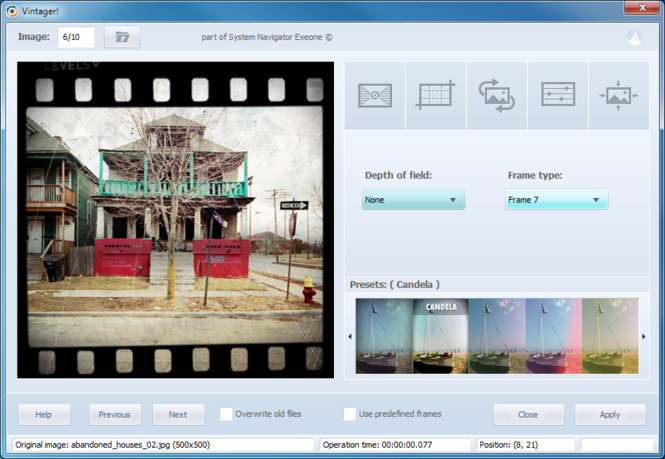 Vintager is fun, creative and easy-to-use software that provides you with a set of tools that give your photos retro or vintage style through a number of special effects.Its simplicity and perfected design allow you to apply many different filters, effects and adjustments to your photos giving them a professional and crafty look. And that is not all. Crop, resize and rotate tools let you separate parts of your photos, and size them to your needs adding even more freedom to turn your photos into a real artwork. And that is not all either. You can add a frame around your photo to give that final touch that will transform it into something you will WANT to share with your friends and family.