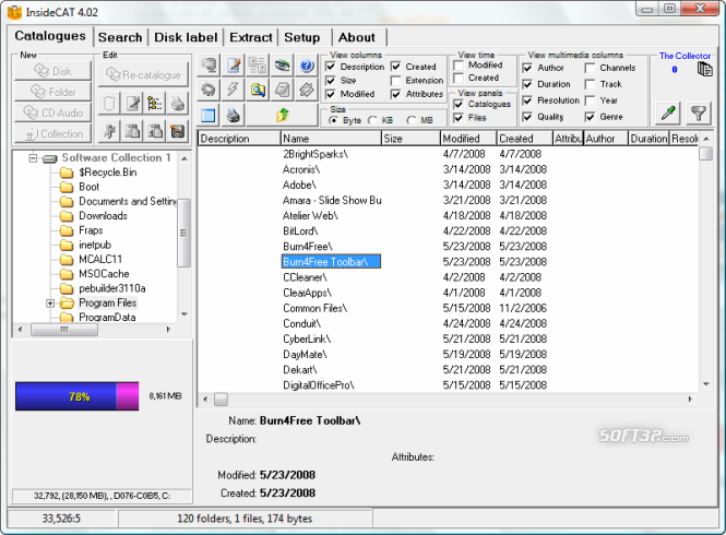 InsideCAT is an automatic indexer/cataloguer program for all your PC disks (CD, DVD, HD, USB, CD-Audio, floppy, folders...) with an excellent support for compressed and multimedia files. No typing needed!. It enables you to locate any file in a fast way. Never loose a file again!. A must have if you used to burn cd/dvd disks. Main features: index all the files and folders from any PC disk. Index CD-Audio automatically (Internet / CD-Text) or manually. Organize your disk catalogues in collections and sub-collections. Compressed file support available for 14 different formats (ZIP RAR CAB ACE JAR ARJ LZH LHA ARC ZOO PAK TAR GZIP SQX EXEs). Emergency decompressor for all formats, including EXE. On-the-fly decompresion of single files to open them, including EXE. Also catalogues the most important metadata from 29 multimedia file formats (DOC PDF BMP DIB RLE PCX JPG JPEG2000 GIF PNG TIF TGA WAV AC3 MP3 WMA OGG AVI WMV ASF MPG ...). Thumbnails and EXIF data are extracted from photo files. Powerful file search funtions, five text searchings (exact, wilcards, superwilcards, Perl RegExp, fuzzy). Searchings for duplicated files. It also makes compilations of files from all your disks. CD/DVD label and covers designer with automatic functions. Five ways to open files directly. Six configurable printing functions. Four database exporting functions. AutoRun CD/DVD function will remain disabled while you are working. Easy to use. Context menus. Intuitive (similar to Windows Explorer in "detail view"). Very fast: it works with thousands of disks/catalogues and millions of files!.