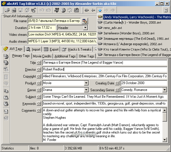 abcAVI Tag Editor is little stand alone utility for viewing/editing tags in AVI files. In short it allows you to get information on movie from Internet Movie Database or type it by yourself and save that info inside AVI file. Supports RIFF INFO tags, MovieID tags, IDivX tags. Allows editing more than 40 tags, not only "Title", "Subject" and "Copyright". Support of RIFF INFO tags ensures backward compatibility with standard Windows players like MS Media Player.abcAVI Tag Editor shows complete information on AVI file both in tree style and in short form. It recognizes more than 770 FourCC and TwoCC codes (shows complete names of audio/video codecs used). Has predefined lists of contents for some tags (Product, Genre, Rated, Language, Source form and Medium). Allows multiple file editing - supports Drag-and-Drop files and directories to the main window (for example from "Find files" window), embeds its item to the MS Explorer context menu.