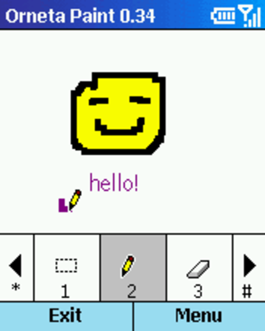 Orneta Paint is a drawing tool for Windows Mobile based Smartphone's you can use to create simple or elaborate drawings. Drawings can be black-and-white, color, saved as bitmap or jpeg, sent as e-mail attachments. Edit images from your phones camera. Functionality: Create or Edit (BMP and JPEG), one handed operation, three cursor types, send as an e-mail attachment. Toolbox support: pen, selections, eraser, fill, text, color, and line width.