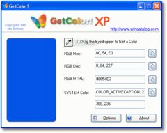 GetColor! allows you to retrieve the color of any pixel on your desktop easily: just move the eyedropper tool into any place of your desktop and GetColor! will show you the color value!This handy color-picker tool helps you to know the exact value of any color on your desktop. The color value is diplayed in 4 main forms: RGB, HEX, HTML and WinAPI constant (COLOR_*), and you are able to copy one or all of them to clipboard.