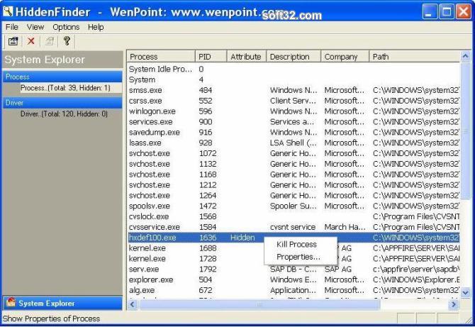 HiddenFinder is an advanced security utility which can detect and kill hidden processes and drivers. Hidden processes and drivers can be the result of sophisticated virus or spyware attack. Recent research shows more and more spyware, virus, rootkit and backdoor attacks are being facilitated by these hidden viral and Trojan processes which can hijack your system, act as a back door to bring in even more spyware and viruses, or worse turn your computer into a slave zombie machine or malicious mail - server under the control of a remote computer. HiddenFinder shows all running processes and driver including hidden process which can be killed instantly. The termination of hidden process immediately stops a major portion of the Trojan or viral software attack. Properties and online google search of the process and driver, are also available by right clicking. Similar Software