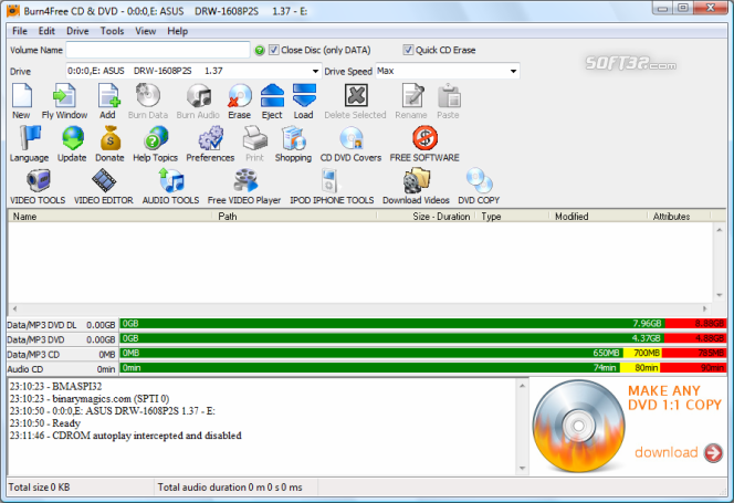Burn4Free is a free dvd burning software. Easy to use. Compatible with more than 3000 CD/DVD drives. Copy DVD. Burns data and audio from different files types (WAV, WMA, MP3, OGG, FLAC, WavPack and .CDA (Import