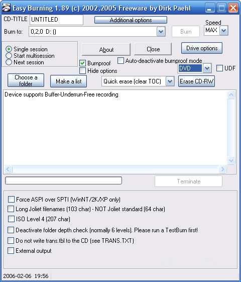 EASY Burning is the easiest way to backup your files in a cdr(w). Integrated to the shell (send to) or used as a normal application, EASY Burning works with any CD writer. .Write a folder and files, pictures and what ever you want. Easy to use. Create Data CD from a folder. Backup your MP3 collection. Integrated into Shell. send to Integrated into Desktop. Designed for Windows 98, Me, 2000, XP. Multissession support. A special DVD on my site Similar Software
