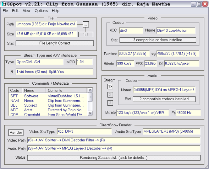 ? Shows framerate, duration, aspect ratio, bitrates, AVI structure info, and more.