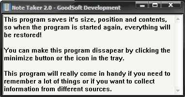 The Note Taker will really come in handy if you need to remember a lot of things or if you want to collect information from different sources.This program saves it's size, position and contents, so when the program is started again, everything will be restored!You can make this program dissapear by clicking the minimize button or the icon in the tray.