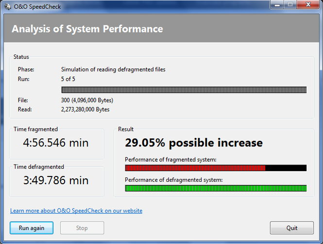 With O&O SpeedCheck you can simulate your Windows system in a fragmented and defragmented state. No data is written in the simulation, it simply reads test data from the hard disk. After completion of the simulation you will be shown a comparison of the two test times, and the possible increase in speed available to you. You can see just how much your PC could be accelerated by regular and thorough defragmentation.