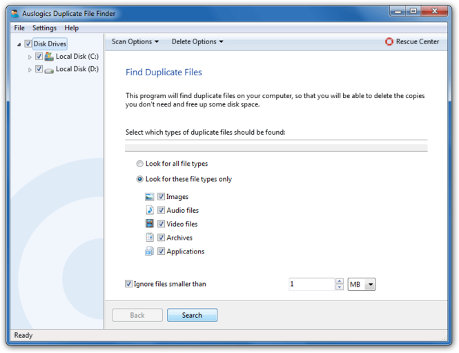 Auslogics Duplicate File Finder is a nifty free utility that will help you get rid of useless duplicates and reclaim up to 50% of free hard disk space. It will ask you for duplicate files search criteria - you can match files by name, date and time they were created, size, and even contents. Then it will do a quick but thorough search and present you with the list of duplicate files. You can review them before deleting any. That way you can avoid deleting any files that are not duplicates, but match your search criteria.