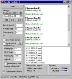 Burn To The Brim is a utility for grouping files and folders together in the most efficient way to fill up an entire CD, DVD or other medium. It can output the resulting structure to an ISO 9660 file, ready to be burned with most CD-burning tools.The program is optimized for quick performance and considers the most promising options first. It also minimizes the search length by fast detection of dead ends. The program cuts corners whenever possible (without missing anything). Folders can be split up to a set level for more versatile splitting options.