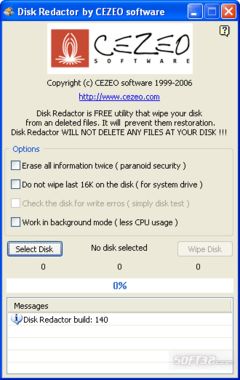 Disk Redactor is a WIPE utility that lets you securely erase any old ( deleted ) files and prevent them from being recovered. All your private sensitive insecurely erased information will be wiped from free unused space on your drives to ensure complete data destruction.