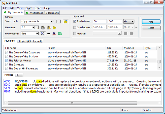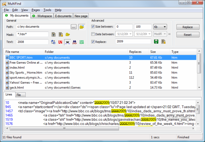MultiFind is a lightweight efficient file search and replace application. It allows to search multiple files by text string, binary data, regular expression, file size, file date and more. Key feature of MultiFind is that multiple searches/replaces can exist at the same time. Each of them appears in the separate tab page. Compact layout makes it possible to see all the options related to the single search/replace in one window.