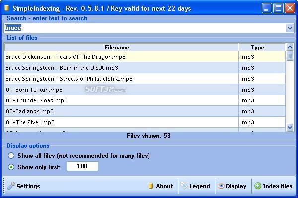 Your mp3 collection is too big to search over and over looking for your favorite song? Have tons of unorganized downloads, music or documents? Why not index your files so you could know exactly where your files are. SimpleIndexing will happily do that for you. SimpleIndexing is your small program for managing files. Easy to use, very user-friendly and simple. It supports drag/drop so you can copy/move/enqueue files directly from SimpleIndexing to any other program supporting drag/drop like winamp or your favorite video player. Similar Software