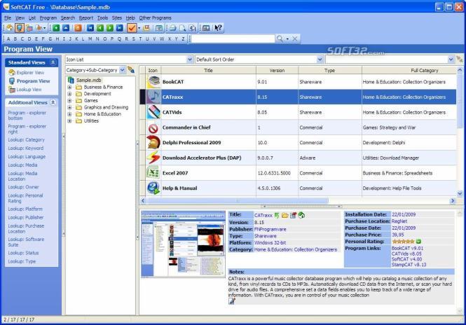 SoftCAT Free is the ultimate software organizer database. SoftCAT Free will help you know what you have and where it is, but it will also help you keep track of important information like serial number, and other registration information. You never know when you need this information! More than 30 data fields will help you track information like program title, version, publisher, platform, type (commercial, freeware, shareware, etc.), category (Desktop Enhancements, Games, Utilities, etc.), price, installation date, installation folder, product homepage, serial number, and registration name.