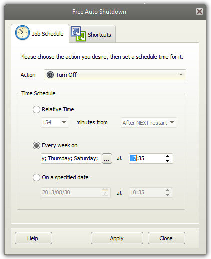Free Auto Shutdown is a handy utility for automatic PC shutdown. It helps you automatically shut down the computer when the job is finished. You don't need to wait up for things that could really take some time to be done, like movie/game downloading, video conversion, music recording and some automated tasks. Free Auto Shutdown can set a schedule for your computer to shut down, restart, standby or hibernate. It provides customizable keyboard shortcuts to perform all the actions.Free Auto Shutdown is able to create schedule to perform the action you choose after next/every restart, once, daily, weekly or on a specific date. When you apply the schedule, it hides its icon on Windows taskbar and runs silently in the background, taking minimum system resources to operate. With this free PC shutdown software, you just leave your programs to do the work and go to sleep. It is always beneficial to let your computer have a rest when it finishes what it needs to do.