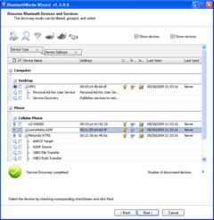 BluetoothWorks Wizard allows you to detect all Bluetooth-enabled devices around your computer and discover all services that are offered by discovered Bluetooth devices.The results of Bluetooth Device Inquiry and Service Discovery are presented in highly-customized report control that enables grouping and sorting the results by variety of criteria. For example, the devices can be grouped by Device Type (such as Computer or Phone) and device Subtype (such as Cellular phone, Smart Phone, etc.). This kind of grouping is done by simply dragging and dropping the report control's column header to the ribbon located above the control's columns.