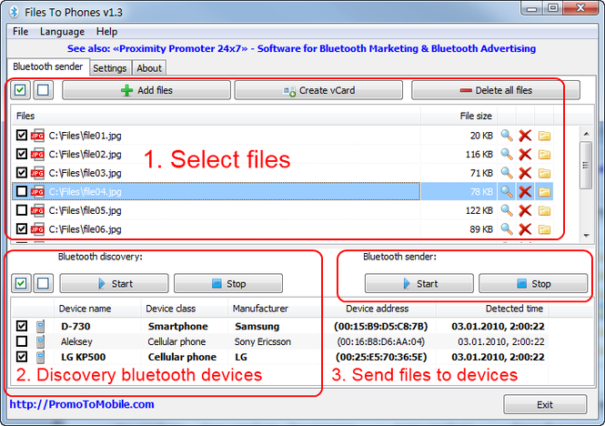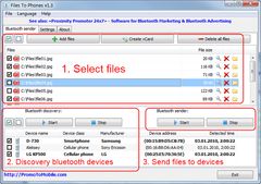 How to send files from PC to mobile phone? "Files To Phones" - provides free transmission of any files (TXT, MP3, JPG, 3GP, MP4, vCal, vCard) to any Bluetooth devices (mobile phones, smartphones, hand-held devices, communicators, laptops, mini-laptop computers) within coverage over Bluetooth. Does not require any special software or hardware - only a computer (PC, laptop) and a Bluetooth dongle. Absolutely any files can be distributed. Simultaneous distribution of files to 1...7 Bluetooth devices located within coverage area. Supported BlueSoleil, Toshiba, WidComm/Broadcomm and Microsoft stacks. Similar Software