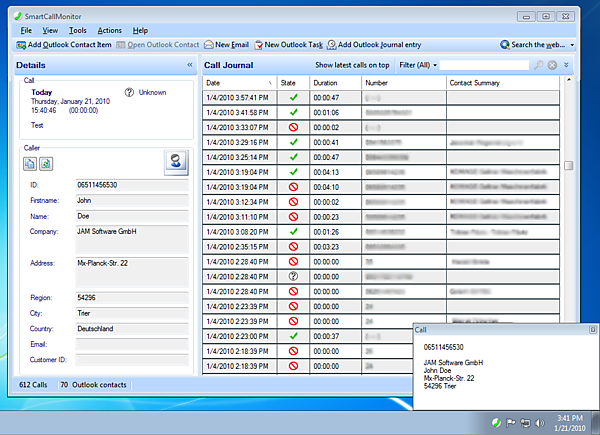 SmartCallMonitor is the easy-to-use calling and monitoring software for TAPI capable hardware like a telephone system or an ISDN card. It automatically tries to match incoming phone calls with data stored in your MS-Outlook contacts to provide information about the caller (e.g. name, address etc.). Information will be shown in a clearly arranged datasheet. If SmartCallMonitor can not find matching information about the caller in your MS-Outlook contacts it can use an internet reverse search service to obtain information about the caller. With SmartCallMonitor you always know who is calling and whose call you could not answer. SmartCallMonitor can simplify your daily office routine by monitoring incoming calls, saving information about the caller (e.g. time and date of each call), creating call back reminder and many other features.