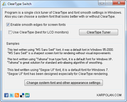 Options for text anti-aliasing ("Smooth edges of screen fonts") and ClearType are located in different places depending on Windows version. This is very annoying and confuses users much! In Windows XP all these options are accessible via "Display properties" -> "Appearance" -> "Effects". Quite logical, isn't it?