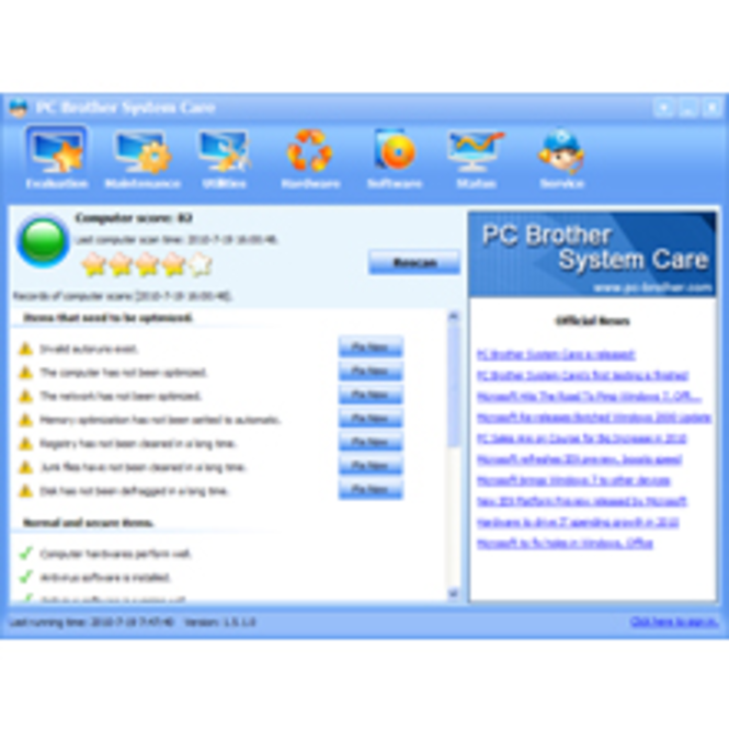 PC Brother System Care, a powerful application for free, which can protect and optimize PC. Any pc problems can be solved by this application. PC Brother System Care enables: Computer Evaluation, System Maintenance, Computer Optimizer, Hardware Maintenance, Software Management and Data Analysis that can help your PC operate more efficiently and run faster.