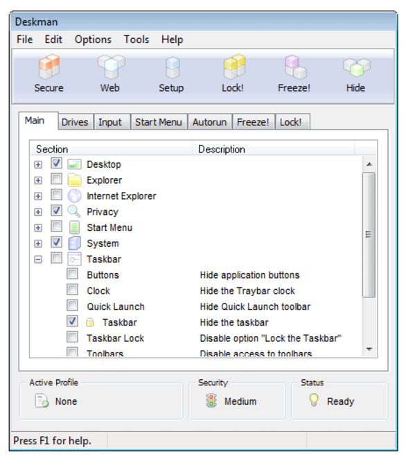 Deskman allows you to protect desktops easily. Restrict access to system settings and keep your desktop tightly secured from a simple interface. Home users need a simple way of protecting their computers on coffee breaks, or restraining access to their desktop on shared computer environments. Securing your Desktop has never been so easy. Similar Software