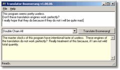 Google Translator Boomerang is a silly little program that uses the Google Translation engine to translate your english text to foreign languages and then back again into english, for some amusing results. Use it to generate zen poetry or examine how well the translation of your text really matches with your intentions. You might be surprised to learn how your words may come across in another language. Similar Software