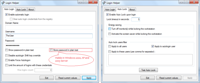 Login Helper will help you easily set up or just check the current state of the Windows auto login feature. With it you can easily set the Windows auto login or check its current settings. In addition it is combined with Auto Lock, which is user aware and has basic power saving capabilities(can turn of monitor or activate the screen saver if the PC is being locked). Similar Software