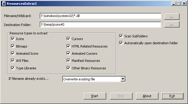 ResourcesExtract is a small utility that scans dll/ocx/exe files and extract all resources (bitmaps, icons, cursors, AVI movies, HTML files, and more...) stored in them into the folder that you specify. You can use ResourcesExtract in user interface mode, or alternatively, you can run ResourcesExtract in command-line mode without displaying any user interface.