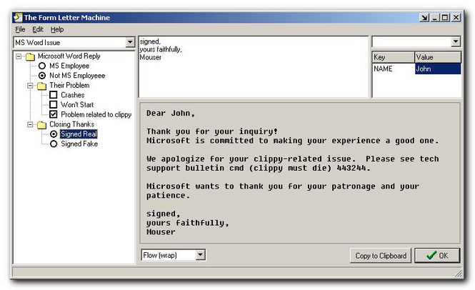 The Form Letter Machine is a utility to help you write repetetive emails or documents that tend to be made up of various configurations of preset text paragraphs; a very simple interface makes it easy to combine components. Build your own configurations using checkboxes and radioboxes and nested groups, and then easily write new letters by checking off the components you want. Nice preview and ability to fill in custom fields, plus support for optional word wrapping. Similar Software