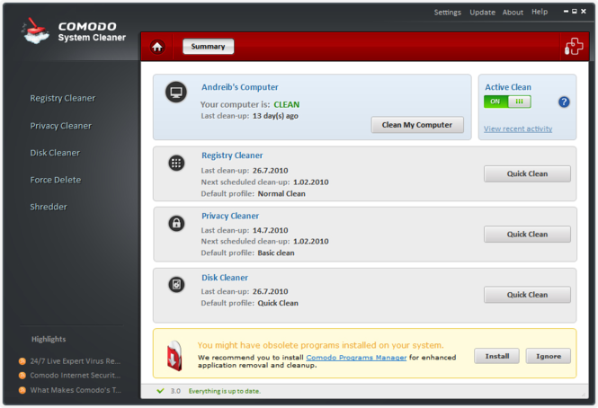Clean your PC, 100% Safe, with the Comodo System-Cleaner! Nowadays it's a real challenge to find a desktop product that meets all the daily maintenance needs. Fortunately, Comodo System-Cleaner took this task, and fulfilled it with success. You can make a cleaning profile and send it to your friends, have an instant result from a scan, or simply let the program handle automatic cleaning. And if you worry about deleting something by mistake, break no sweat. Comodo System-Cleaner has the SafeDelete feature which takes that worry away. Main features * Registry Clean - Remove any corrupt or unnecessary registry entries; * Disk Clean - Boost your PC's speed by cleaning out its junk. Delete duplicate files and needless archives; * Privacy Clean - Protect your privacy by removing all your privacy traces from the system; * Delete locked entries - Delete locked files and registry entries using Force Delete; * Shred your personal data - Permanently remove files, partitions and entire disk data with Shredder, in order to protect your privacy; * Easy-to-use GUI - GUI just got easier to use. Use our default cleaning profiles or create your own. Cleaning your computer is just one click away. New features * Registry monitoring - You can get instant scan results to registry entries also; * Force delete - You can now delete not only locked files but locked registry entries also. Improvements * Best scan speed - Get instant scan results with our monitor driver. Cleaning has never been faster; * Better clean speed - Improved clean engine, with 30% boost in performance. Innovation & technology * Active clean - Select "Active Clean" mode and you will never have to press a button. System-Cleaner will do the clean for you; * Smart cleaning profiles - Define your own profiles for the best cleaning experience. Similar Software