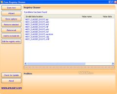 Free Registry Cleaner is Registry-cleaning software. It will safely clean and repair Windows Registry problems with a few clicks and enable you to enjoy a cleaner and more efficient PC. The Registry is the nerve center of your PC, and problems with the Windows Registry are a common cause of Windows crashes and error messages. Free Registry Cleaner also finding and removing common junk files that accumulate over time. It comes pre-configured with 22 types of file extension that can usually be considered disposable, and you can extend the range by adding your own file types. Similar Software