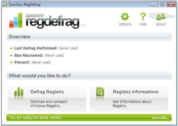 Quicksys RegDefrag is a freeware utility to defrag registry. Improve whole performance and boost access to registry.Registry data is constantly being written to and removed during a normal Windows operation. Over time this data becomes fragmented. Quicksys RegDefrag optimizes registry by removing gaps, fragments and wasted space in Windows registry files.