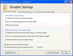 Disable Startup is a free startup manager and monitoring program of www.disablestartup.com, it can scan all Windows Startups on your computer, and monitor all new startup items, provide protecting for Windows Startup from changes, it can helps you to optimize Windows startup, alert when new items are added. Disable Startup can monitor Internet Explorer start pages changes too. This is one good tool to control and manage program that will start automatically when Windows boots. You can enable/disable selected items that you want. Similar Software