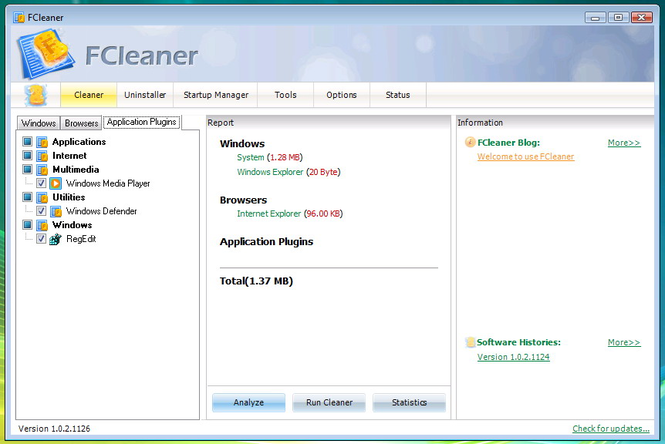 FCleaner is a freeware all-in-one Windows disk and registry cleaning and optimization tool. It removes unused files and invalid registry entries that are eating up your disk space and slowing your system down, tweaks your system and allows your Windows to run faster. FCleaner can also protect your privacy such as Internet History, the Cookies that websites leave behind. You can erase all the traces of your online activities in just one click with the help of FCleaner. FCleaner is free, but it does not contain any Spyware or Adware.FCleaner Features List