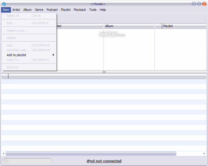 Floola is a freeware application to efficiently manage your iPod or your Motorola mobile phone (any model supporting iTunes). It's a standalone application that can be run directly from your iPod and needs no installation. Floola supports all common used iPod features including artwork, podcasts and smart playlists! It's also able to convert audio or video incompatible with the iPod so that you can copy almost any file to it. It even allows adding youtube and myspace videos just entering the page url!