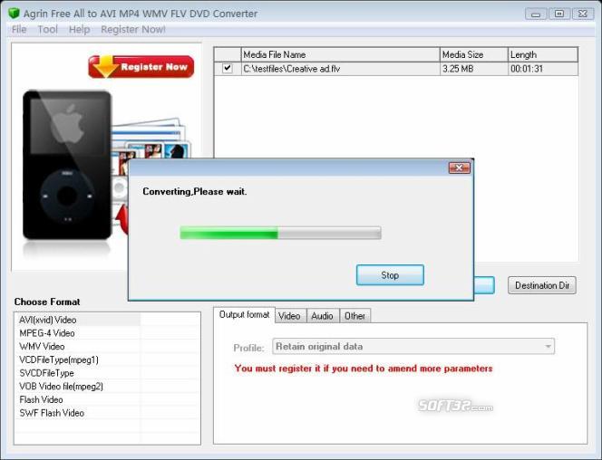 Agrin Free All to AVI MP4 WMV FLV DVD Converter is very specially designed for converting video files to AVI,MP4 etc. With the versatile converting functions, you can easily create AVI,MPEG4,WMV,MPEG,VOB,FLV,SWF from video files including AVI, WMV, MPEG, MPEG4, ASF, VOB, 3GP, iPhone, MOV, FLV in short time. You must feel like it after trying its powerful functions.You can set encoding parameters including video size, video quality, frame rate, aspect, audio quality, sample, channels and volume to get the best video quality. It also provides the Input/Output preview function.